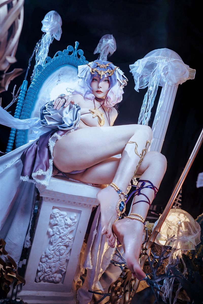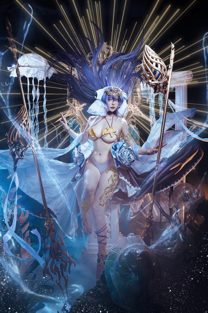 在这次的波塞冬cosplay中,秋和柯基再次展现了她对角色的精准把握和对细节的极致追求。 波塞冬是古希腊神话中的海神,掌管着海洋的神秘力量,秋和柯基通过服装、道具以及妆容的精心搭配,完美地再现了这一神话人物的形象。 她的眼神中透露出波塞冬的威严与力量,仿佛真的能够召唤海浪和风暴。
