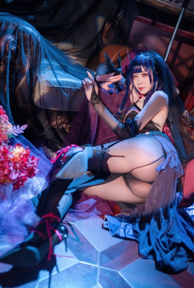 在 安食Ajiki的这套作品中,她选择了原神中的雷电将军这一角色,并且大胆地将其与魅魔元素相结合,创造出了一个既神秘又充满诱惑的形象。